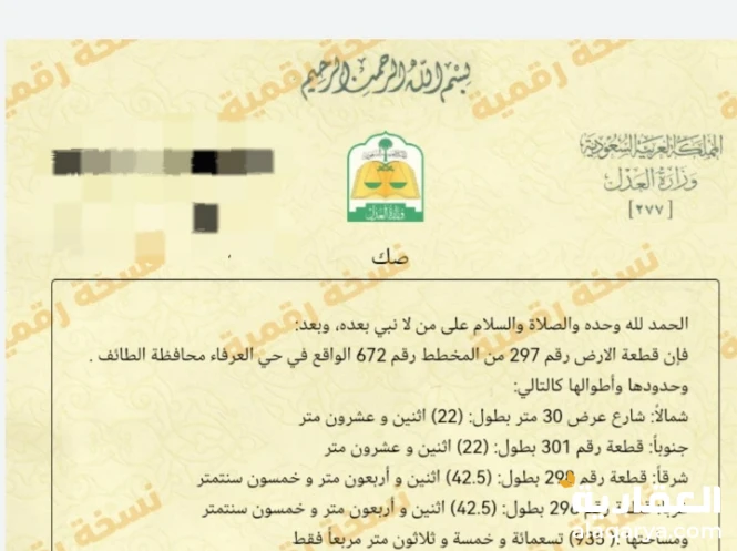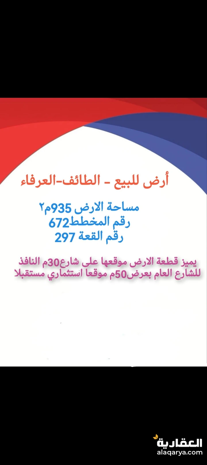 ارضـــــى للبيع منطقة مكة المكرمة محافظة الطائف ضاحية العرفاء موقع العرفاء 4 الطـــــايف ارض في مخطط العرفاء 4 في الطائف رقم المخطط 672و رقم القطعة 297وعرض الشارع 30 متر ومساحه 935 متر نافذ لطريق ال50 متر موقع استثمار وسكني مميز الارض موقعها المتميز وتصلح كا موقع استثماري مستقبلا حسب مساحتها والمبني المنشي عليها حسب التخطيط الهندسي الممتاز ترخيص الإعلان العقاري رقم 7100094540 عقد (بيع وتسويق ) برقم 6100097012 رخصة فال رقم 1100005933 وصل السموم للقطعه مبلغ 330الف والسعر المطلوب 355الف لتفاصيل اكثر التواصل بنا للصك والصور والموقع