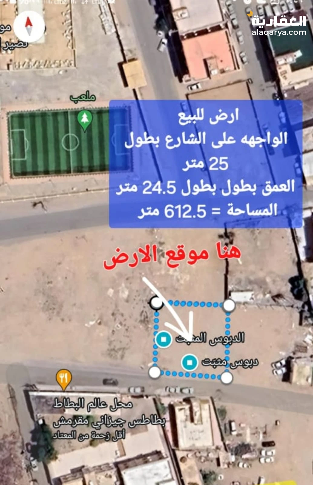 ارض للبيع منطقة جازان محافظة ابوعريش حي النسيم ارض بمخطط رقم 403في رقم القطعة 5 ومساحه 612.5 متر بعرض شارع 10متر نافذ لطريق ال30 متر التجاري بأبوعريش وواجتها بطول 25متر والعمق 24.5متر يميز موقع الارض استثماري كون المخطط مبني بنسبة 95% مقابل محلات تجاريه تموينات وكوفي وبالقرب من اسواق العثيم وتوفر جميع الخدمات موقعها استثمار وسكني مميز الارض موقعها المتميز وتصلح كا موقع استثماري حسب مساحتها والمبني المنشي عليها حسب التخطيط الهندسي الممتاز ترخيص الإعلان العقاري رقم 7100104486 عقد (بيع وتسويق ) برقم 6100109396 رخصة فال رقم 1100005933 وصل السموم للقطعه مبلغ 580الف والسعر المطلوب 610الف صافي للمالك بدون سعي وضريبه وإحتساب نسبة الموقع الالكتروني الذي عرض فيه الاعلان إبراء للذمة لتفاصيل اكثر التواصل بنا للصك والصور والموقع