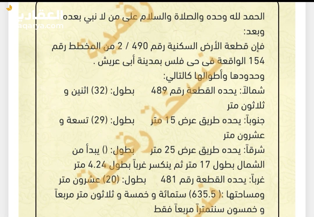 ارض للبيع منطقة جازان محافظة ابوعريش مخطط فلس بمحافظة ابو عريش رقم المخطط 154 ورقم القطعة 2/ 490 ومساحتها 635.5 متر جنوبها شارع 15متر وشرقا شارع 25متر موقعها سكني مميز الارض مستويه موقعها ويوجد عمران في الموقع وتتوفر الخدمات ترخيص الإعلان العقاري رقم 7100106383 عقد (بيع وتسويق ) برقم 6100111792 رخصة فال رقم 1100005933 والسعر المطلوب 250 صافي ال للمالك بدون سعي وضريبه وإحتساب نسبة الموقع الالكتروني الذي عرض فيه الاعلان إبراء للذمة لتفاصيل اكثر التواصل بنا للصك والصور والموقع