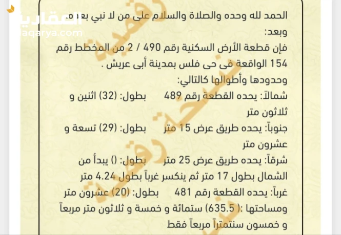 ارض للبيع منطقة جازان محافظة ابوعريش مخطط فلس بمحافظة ابو عريش رقم المخطط 154 ورقم القطعة 2/ 490 ومساحتها 635.5 متر جنوبها شارع 15متر وشرقا شارع 25متر موقعها سكني مميز الارض مستويه موقعها ويوجد عمران في الموقع وتتوفر الخدمات ترخيص الإعلان العقاري رقم 7100106383 عقد (بيع وتسويق ) برقم 6100111792 رخصة فال رقم 1100005933 والسعر المطلوب 250 صافي ال للمالك بدون سعي وضريبه وإحتساب نسبة الموقع الالكتروني الذي عرض فيه الاعلان إبراء للذمة لتفاصيل اكثر التواصل بنا للصك والصور والموقع