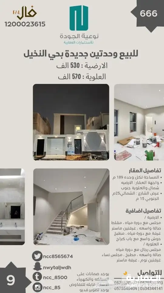 للبيع وحدتين جديده بحي النخيل التفاصيل / ● المساحه لكل وحده 189 م ● العلوية تفتح جنوب على شارع عرضه 15م ● الارضيه تفتح شمال على شارع عرضه 25م تفاصيل الارضيه / مجلس رجال مع دورة مياه مقلط مطبخ غرفة نوم صالة واسعه مع دورة مياه غرفتين ماستر تفاصيل العلوية / غرفة ماستر بالدور الثاني العلوي مع بلكونه غرفة مع دورة مياه بالدور الثاني صاله واسعه مجلس نساء مع دورة مياه مطبخ غرفة مجلس رجال مستقل مع دورة مياه ✔️ كل وحده بصك مستقل ✔️ كل وحده ماء مستقل وصرف صحي مستقل ✔️ كل وحدة كهرباء مستقل ✔️ يوجد ضمان 25 سنه على السباكه والكهرباء ✔️ يوجد تصوير فديو لكل وحده السعر للارضيه : 530 الف السعر للعلوية : 570 الف * الاسعار قابله للتفاوض * معلومات العقار حسب الرخصة نوع العقار : فيلا استخدام العقار : سكني مساحة العقار : 295.59 عرض الشارع : 20 رقم المخطط : 2351 ه واجهة العقار : جنوبية خدمات العقار : كهرباء, مياه, صرف صحي, ألياف ضوئية عمر العقار : اربع سنوات عدد الغرف : 10 الالتزامات الآخرى على العقار : يوجد رهن بمبلغ 892 الف ريال حدود وأطوال العقار وصف الحد الشمالي : القطعة رقم 6914 طول الحد الشمالي : عشرة مترا وصف الحد الشرقي : القطعة رقم 6925 طول الحد الشرقي : ن مترا وصف الحد الغربي : العقار رقم 2546 طول الحد الغربي : ن مترا وصف الحد الجنوبي : شارع عرض 20.00 متر طول الحد الجنوبي : عشرة مترا رقم العارض 1100175355 رقم الترخيص 7100107191