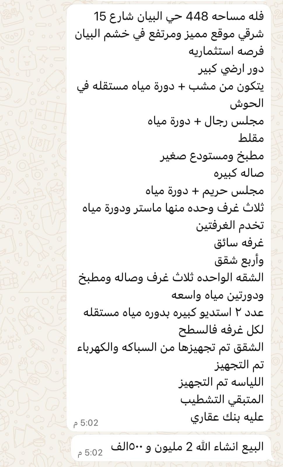 فله مساحه 448 حي البيان شارع 15 شرقي موقع مميز ومرتفع في خشم البيان فرصه استثماريه دور ارضي كبير يتكون من مشب + دورة مياه مستقله في الحوش مجلس رجال + دورة مياه مقلط مطبخ ومستودع صغير صاله كبيره مجلس حريم + دورة مياه ثلاث غرف وحده منها ماستر ودورة مياه تخدم الغرفتين غرفه سائق وأربع شقق الشقه الواحده ثلاث غرف وصاله ومطبخ ودورتين مياه واسعه عدد ٢ استديو كبيره بدوره مياه مستقله لكل غرفه فالسطح الشقق تم تجهيزها من السباكه والكهرباء تم التجهيز اللياسه تم التجهيز المتبقي التشطيب عليه بنك عقاري